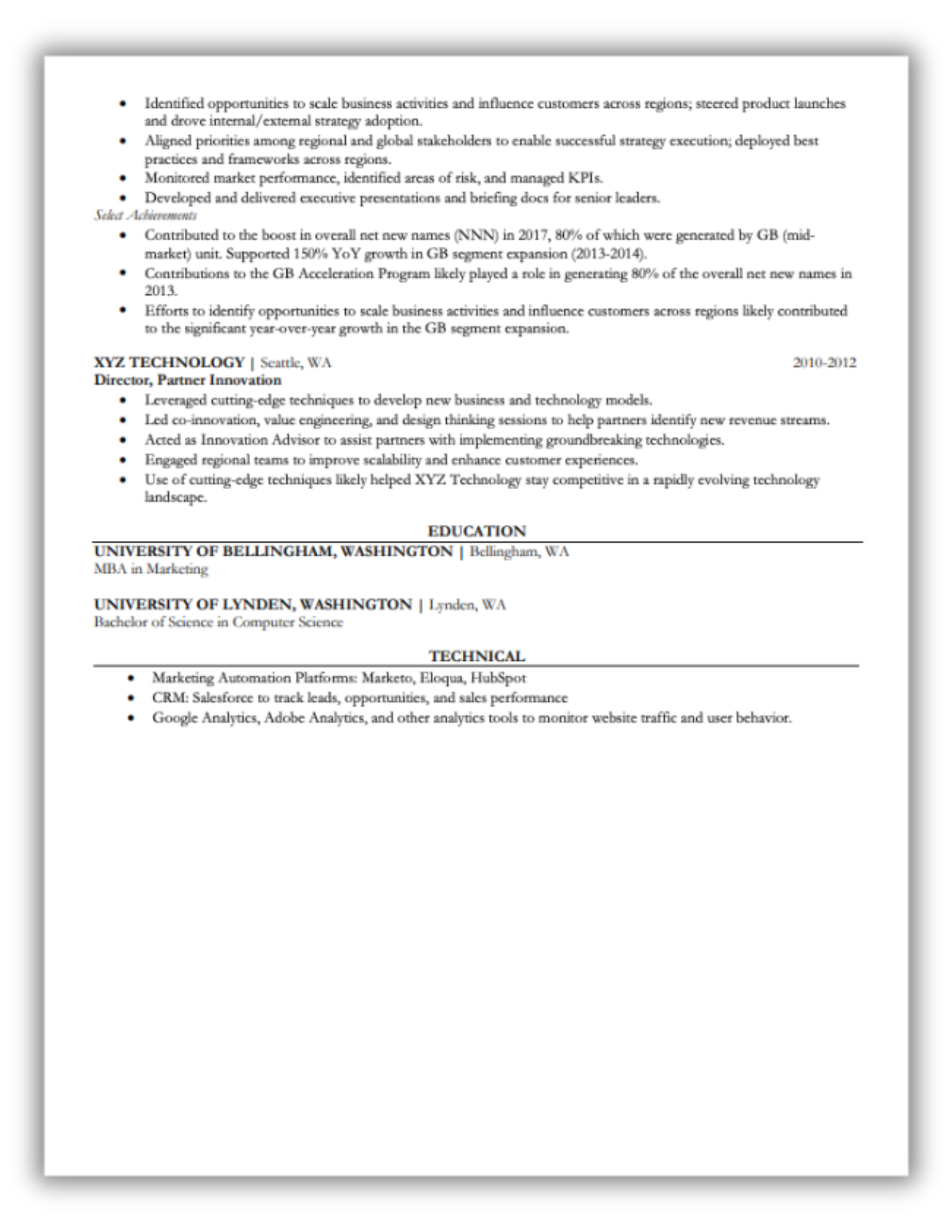 The body of your resume- the experience section, is a vital part of your resume as it enables you to highlight your work history, day-to-day tasks, and key accomplishments. To make the most of this section, ensure that your experience is presented clearly and with impact. Remember to reference the job description and tailor your verbiage to that, as well as highlight tangible successes and KPIs hit.