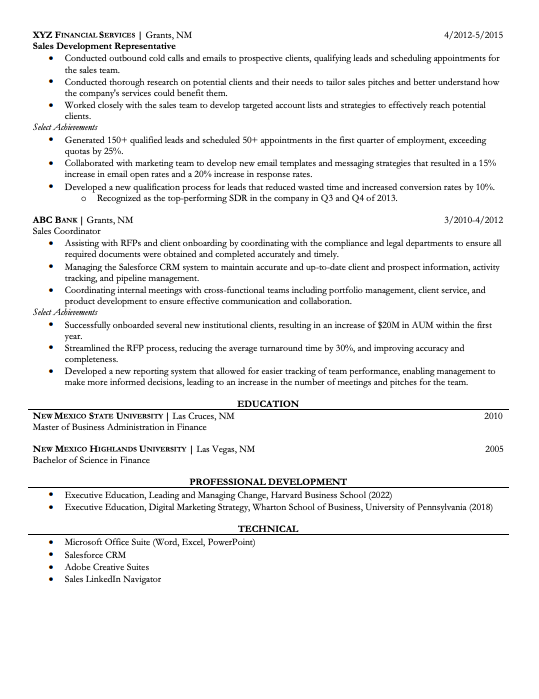 Moreover, mentioning your location can be advantageous, as recruiters may use location screeners that automatically eliminate applicants from other states or regions when applying for a sales position. So, make sure your contact information is up-to-date and accurately presented to avoid missing out on potential opportunities.