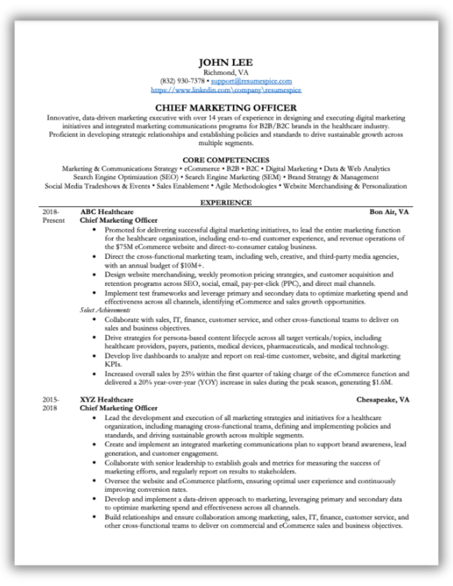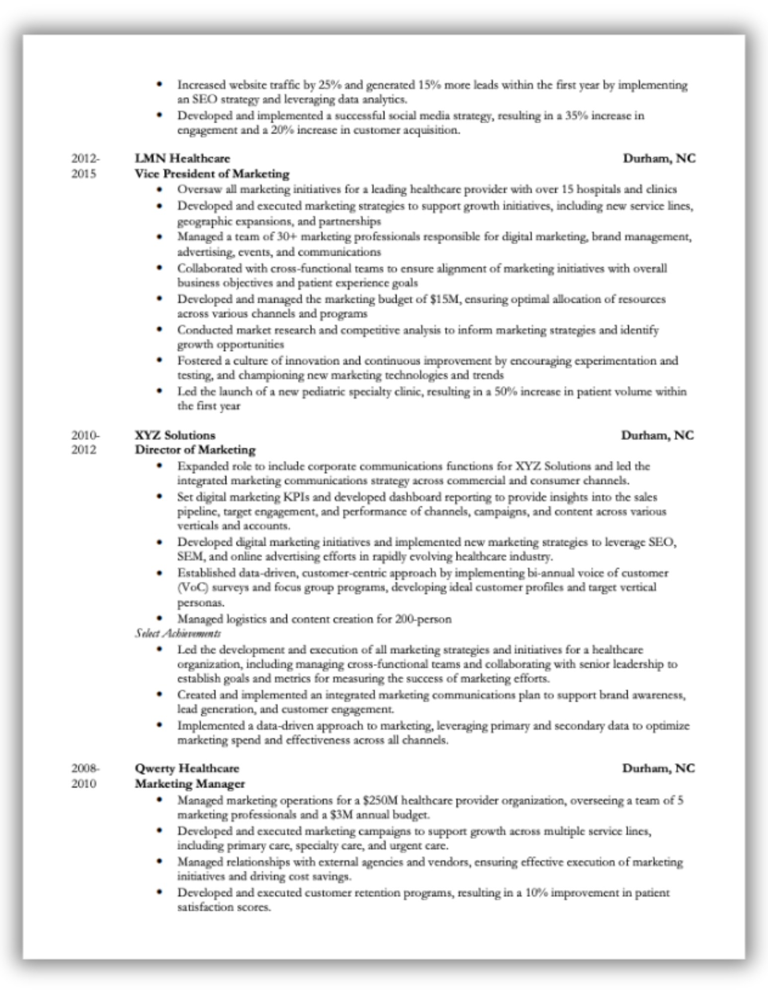 Applicant tracking systems (ATS), software solutions that scan resumes for pertinent keywords, necessitate the inclusion of relevant keywords in your marketing resume. As we talked about earlier, by incorporating appropriate keywords from the job description, you can ensure that your resume is optimized to pass through ATS and reach the hiring manager. By doing this, your chances of being filtered through to the interview process are much higher.