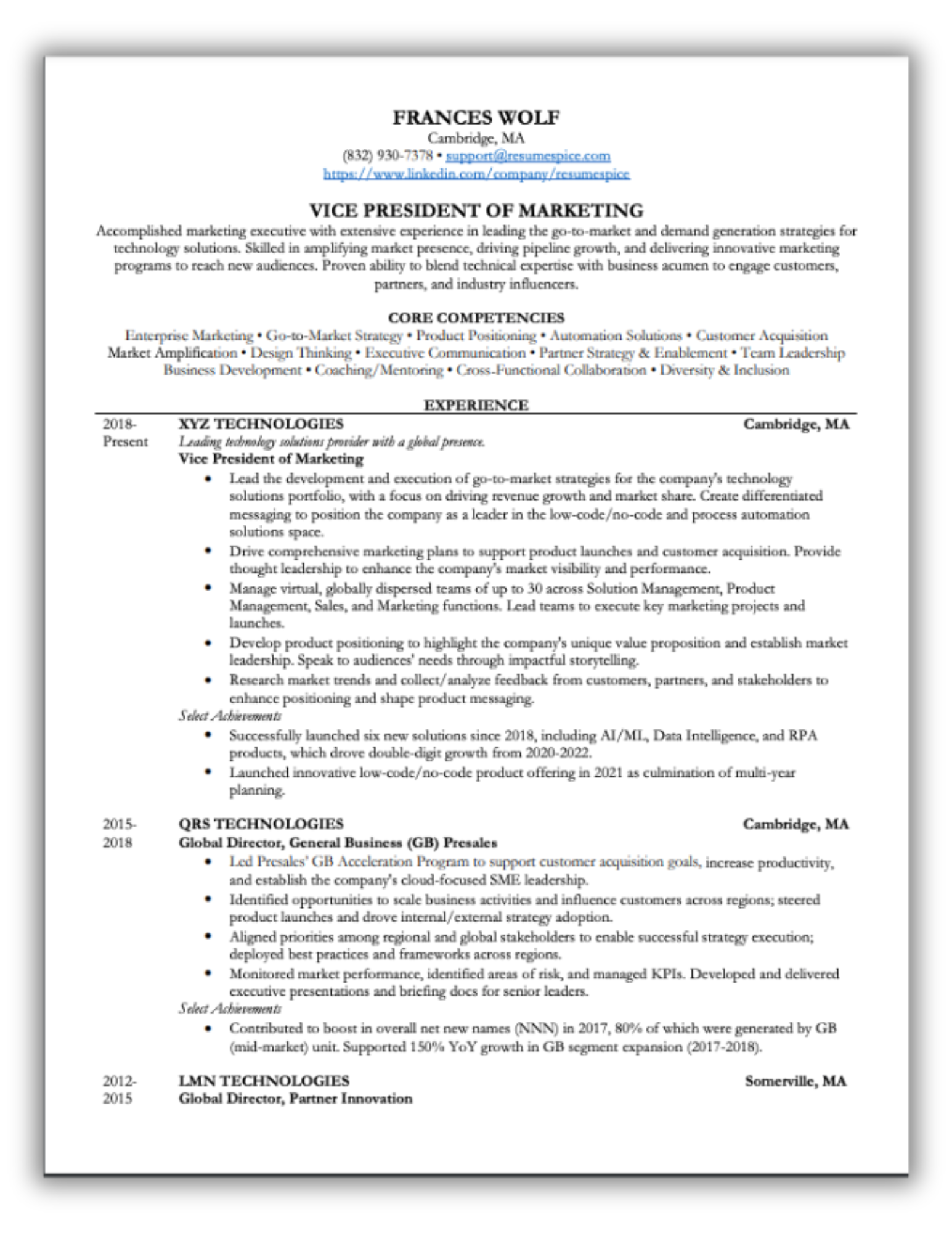 - Include the following sections: contact information, branding statement, core competencies & experience, education, certifications, and technical skills in reverse chronological order